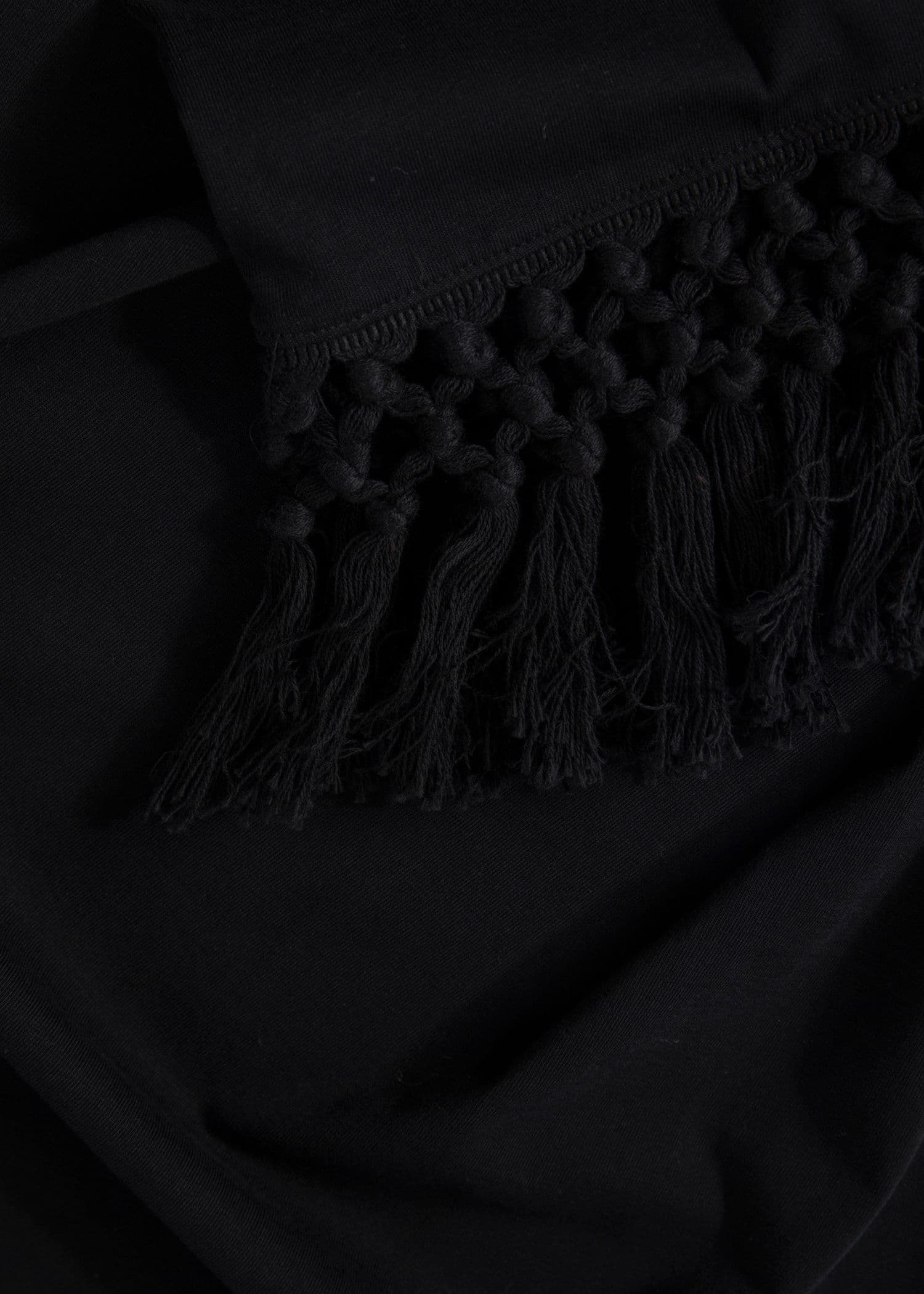 Musta puuvillahame 100 % luomupuuvillaa. Suoran mallisessa hameessa on joustava vyötärö ja hapsukoristeinen helma. Saatavilla on myös yhteensopiva paita.