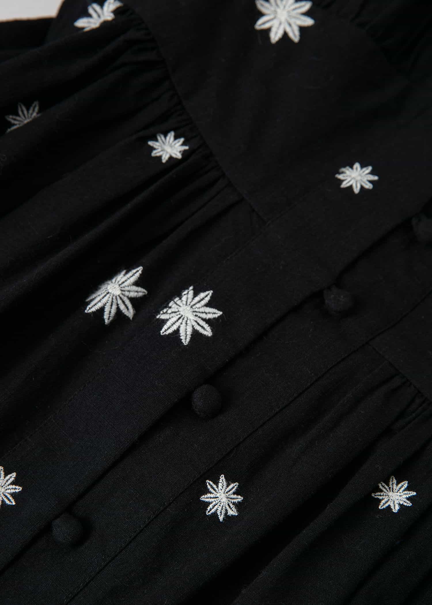 Kirjailtu pitkähihainen mekko. Tässä tyylissä on kirjailtuja valkoisia kukkia, pitkät pallomaiset hihat, klassinen V-kaula-aukko, edessä olevat napit ja imarteleva korostettu vyötärö. This product is GOTS certified, which means it is made from organic material and that every step in the production has been verified by independent certifiers to make sure it meets the social and environmental requirements of GOTS (Global Organic Textile Standard). The material is cultivated without chemical fertilizers or pesticides, from GMO-free crops.