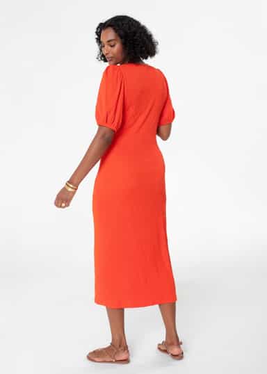 Vartaloa imarteleva yksivärinen mekko ilmavasta jersey-kankaasta. Tässä mallissa on koristenapit edessä, lyhyet puhvihihat ja aukko etuosassa. LENZING™ ECOVERO™ -viskoosikuidut on valmistettu kestävästä puusta ja selluloosasta, jotka on saatu sertifioiduista ja valvotuista lähteistä. Kuidut ovat saaneet EU:n ympäristömerkinnän merkiksi korkeiden ympäristövaatimusten täyttämisestä. LENZING™ ECOVERO™ -kuitujen valmistuksen tuottamat päästöt ja vesistöihin kohdistuva vaikutus ovat jopa 50 % pienemmät verrattuna perinteiseen viskoosiin. LENZING™ ja ECOVERO™ ovat Lenzing AG:n tavaramerkkejä.