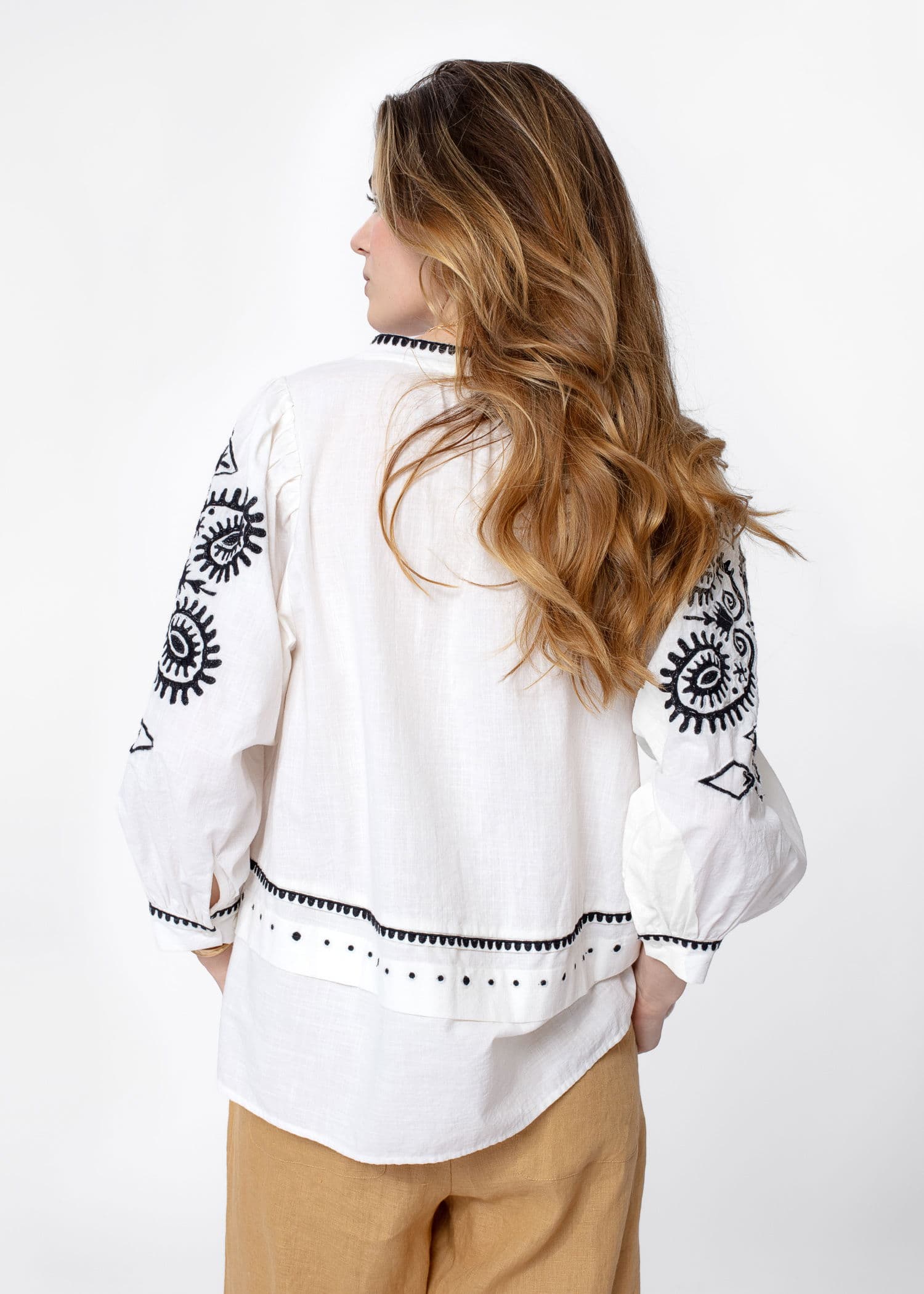 Brodeerattu pusero. Puserossa on mustat kirjailtuja yksityiskohtia, napilliset hihansuut, tupsulliset solmimisnauhat edessä ja tyylikäs v-pääntie. Tyyliä shortsien tai farkkujen kanssa. Tämä kuviollinen pusero on taideteos! Organic Content Standard (OCS) -sertifioidut tuotteet sisältävät luonnonmukaisesti kasvatettua materiaalia, joka on itsenäisesti vahvistettu tuotantoketjun jokaisessa vaiheessa alusta loppuun. Luomupuuvillan tuotannossa ja sertifioinnissa noudatetaan luonnonmukaista maataloutta koskevia standardeja, jotka edellyttävät käytäntöjä ekosysteemien suojelemiseksi.