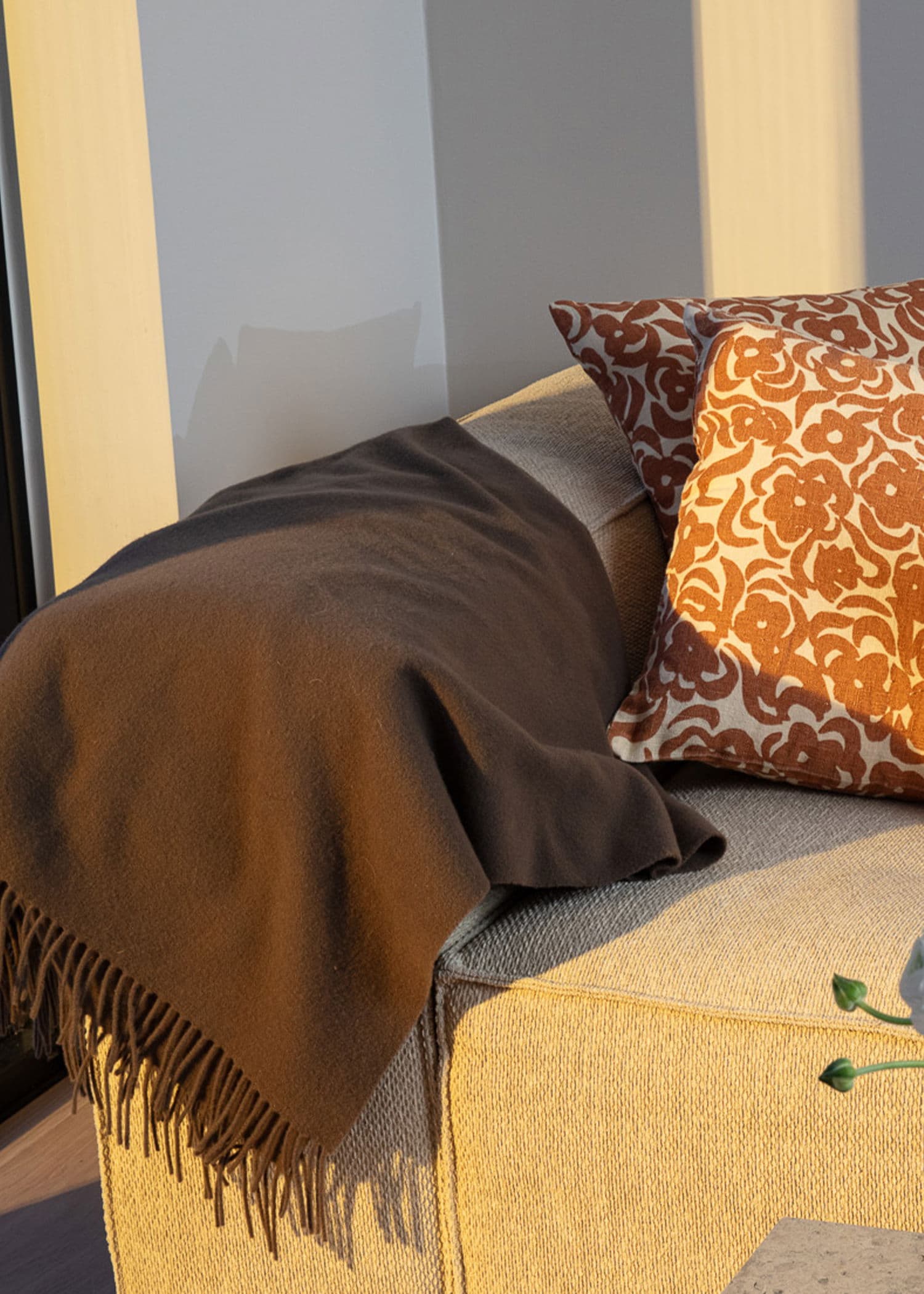 Yksivärinen peitto, 100 % villaa. Peitossa on hapsut päädyissä.