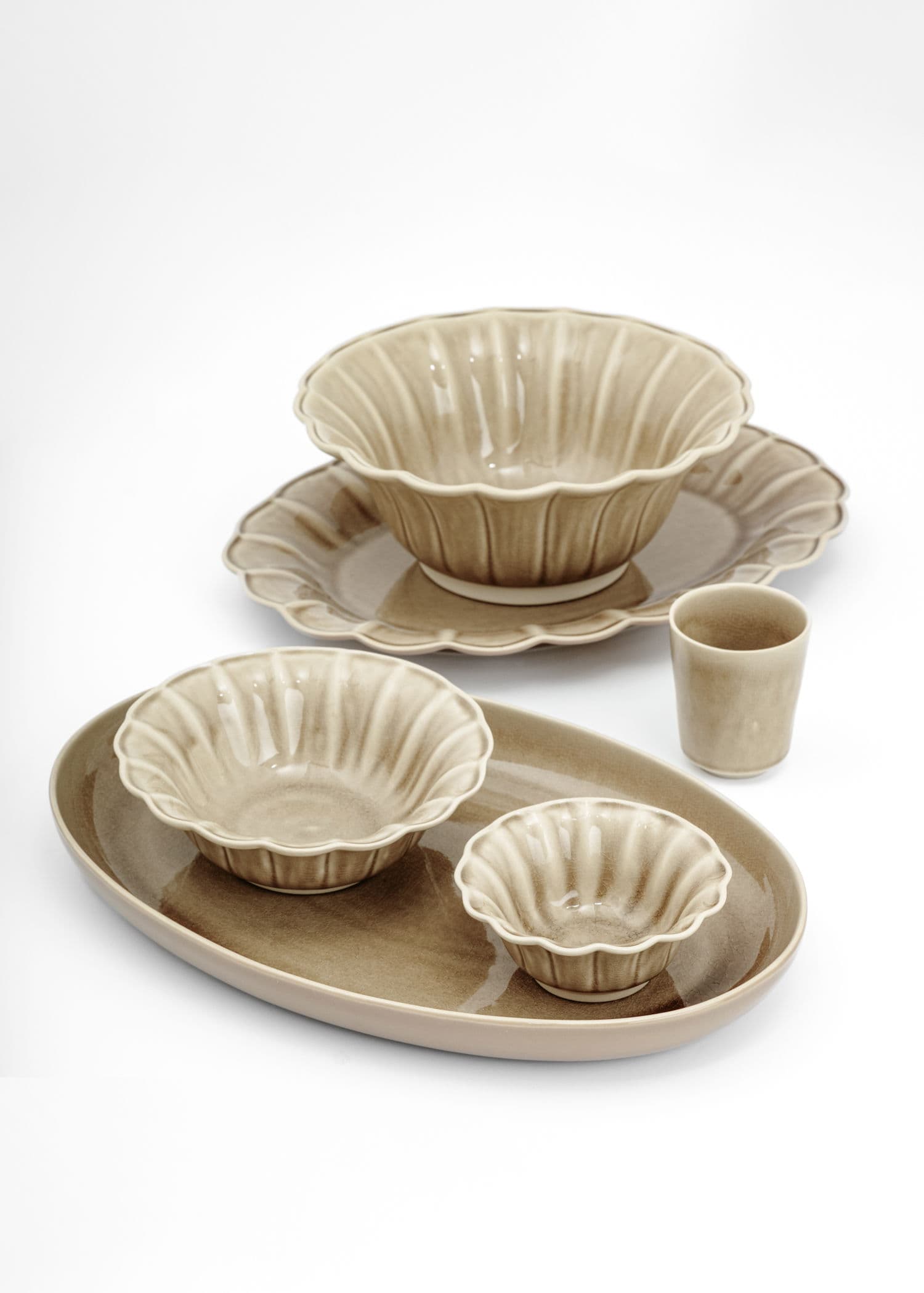 En vakker stor og glasert bolle laget av 100 % steintøy. Denne skålen har bølgete kanter inspirert av havets skjell, og gir serviset ditt et unikt og elegant preg. Perfekt som salatbolle.