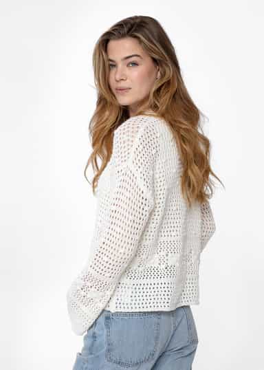 En solid strikket genser med vide ermer, en rund dekorativ hals og et vakkert design. Dette produktet er GOTS-sertifisert, noe som betyr at det er laget av økologisk materiale, og at hvert trinn i produksjonen er verifisert av uavhengige sertifiseringsorganer for å sikre at det oppfyller GOTS (Global Organic Textile Standard) sine sosiale og miljømessige krav.Materialet dyrkes uten kjemiske gjødsel eller sprøytemidler, fra GMO-frie avlinger.