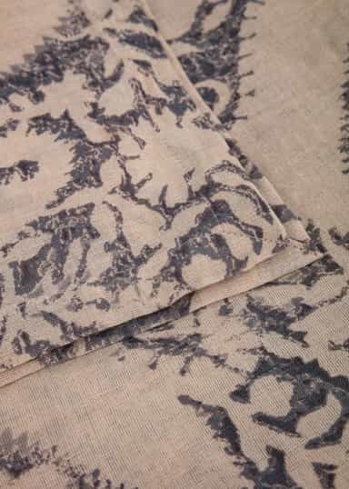 Denna duk har tillverkats av en mjuk men strukturerad blandning av lin och bomull. Varje duk har noggrant screentryckts för hand av skickliga hantverkare med en teknik som har förfinats över generationer. Denna manuella process skapar små variationer och i varje duk, vilket gör dem till ett unikt komplement till ditt hem.