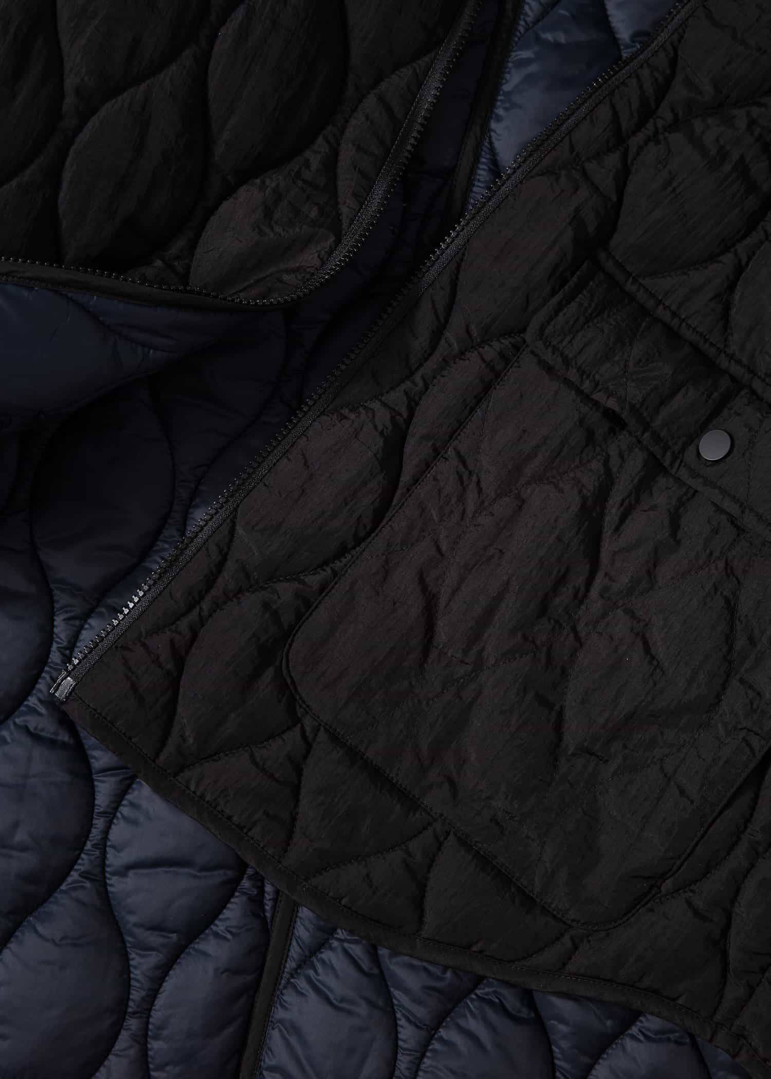 En kort dubbelsidig och vadderad jacka i två olika matchande färger. Ena sidan är i ett mörkblått blankt slätt, quiltat material med två utanpåfickor. Den andra sidan är svart och quiltad i ett material i med mer struktur och har två rymliga utanpåfickor med knapp. Dragkedja framtill, hög krage, rak passform och mudd vid ärmslut. Jackan har en vattenavvisande impregnering med BIONIC-FINISH® ECO-yta. Yttertyg på båda sidor är tillverkat av återvunnen polyamid och vadderingen är av återvunnen polyester. Den här jackan är designad med en lös rak passform. Modellen är 176 cm lång och bär storlek small. Produkter som är certifierade enligt Global Recycled Standard (GRS) innehåller återvunnet material som har verifierats på ett oberoende sätt i varje steg av leveranskedjan, från källan till slutprodukten. Anläggningarna från källan till slutleverantören uppfyller dessutom sociala, miljömässiga och kemiska krav.