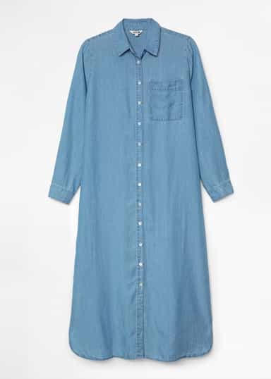 En blå, lång skjorttunika i 100% Lyocell (TENCEL™). Plagget har genomgående knäppning framtill och i ärmslut, långa armar, sidficka, slits nedtill och en smickrande krage. Tencel är känt för sin silkesmjuka känsla, höga andningsförmåga och fuktreglerande egenskaper, vilket gör det perfekt för kläder, sängkläder och underkläder. Lyocell är dessutom naturligt antibakteriellt, skrynklar mindre än bomull och känns svalt mot huden.