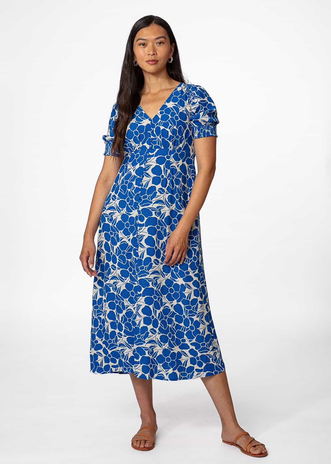 En lång, blå klänning i ett luftigt viskotyg med struktur. Klänningen har en markerad midja, klädda knappar framtill, resår bak och i ärmavslut. Puffärm med resårdetalj, v-ringning och slits framtill. Modellen är 178 cm lång och bär stl small. LENZING™ ECOVERO™ är namnet på en ansvarsfullt tillverkad viskosfiber från LENZING. Råmaterialet kommer från en certifierat förnybar träråvara och tillverkningen sker genom en unik metod som säkerställer 50% mindre användning av vatten och 50% minskade koldioxidutsläpp jämfört med vanlig viskos.