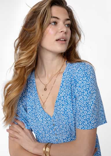 En blå, lång klänning i en vävd viskoskvalitet. Plagget har klädda knappar framtill, markerad midja, korta puffärmar och slits fram. Kommer i flera färger. Den perfekta sommarklänningen som både är vacker, bekväm och luftig. LENZING™ ECOVERO™ viskosfiber är tillverkat av hållbart trä samt trämassa från certifierade och kontrollerande källor. Fibrerna håller höga miljövänliga standards och har blivit certifierade med EU:s miljömärke. Tillverkningen av LENZING™ ECOVERO™ fiber resulterar i 50% lägre utsläpp samt vattenanvändning jämfört med konventionell viskos. LENZING™ och ECOVERO™ är Lenzing AG:s varumärken.