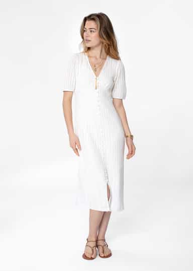 En vit klänning i en mjuk bomullsblandning med pointelledesign. Klänningen har korta puffärmar, en v-ringad hals och klädda knappar framtill. Produkter som är certifierade enligt Organic Content Standard (OCS) innehåller ekologiskt odlat material som har verifierats på ett oberoende sätt i varje steg av leveranskedjan, från källan till slutprodukten. Ekologisk bomull produceras och certifieras enligt ekologiska jordbruksstandarder som förutsätter att metoder för att upprätthålla ekosystem används.