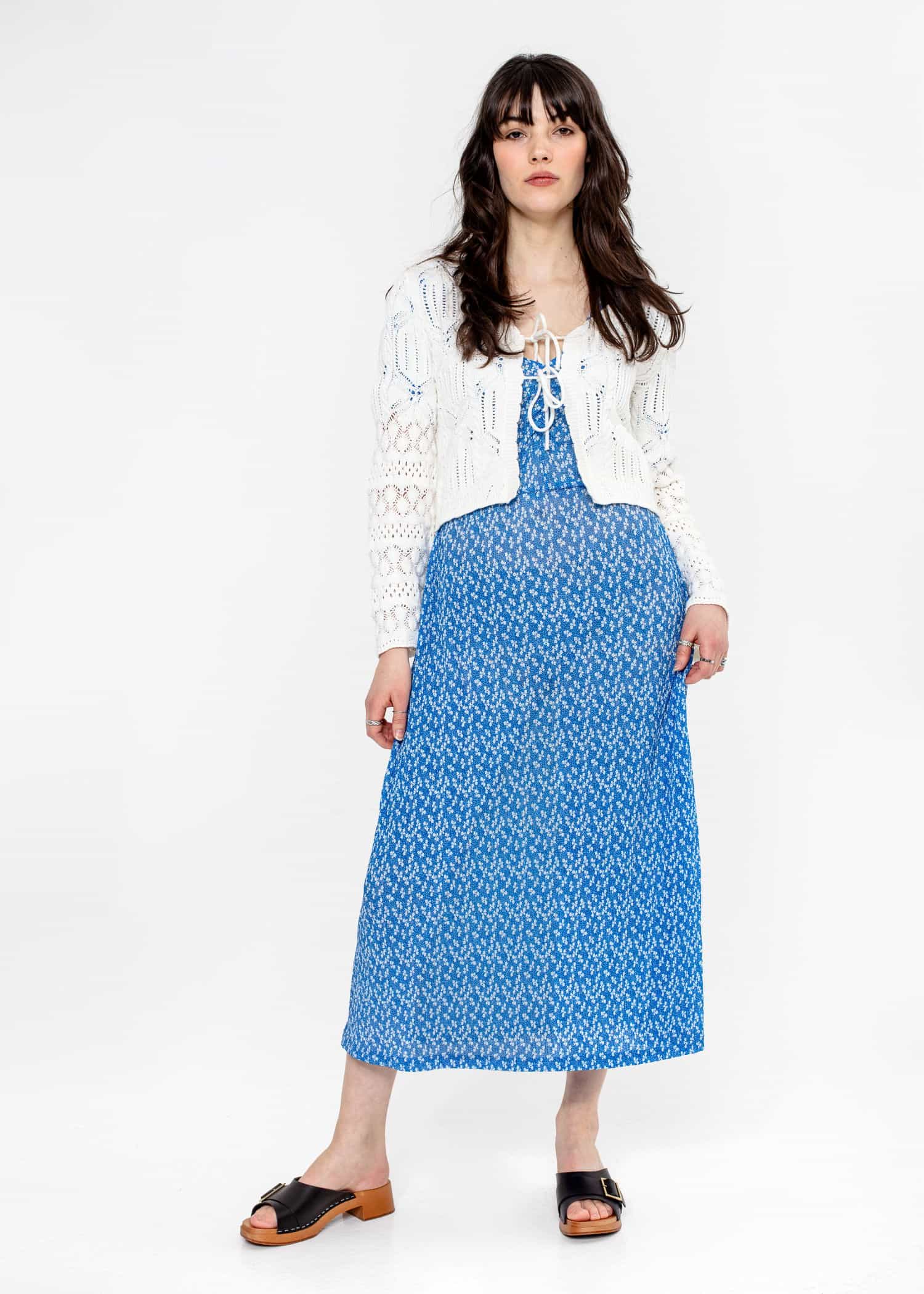 En mjuk hålstickad kort kofta med en figurnära passform. Koftan har en v-ringad hals, långa ärmar och är öppen framtill med knytband. Denna produkt är GOTS-certifierad, vilket innebär att den är gjord av ekologiskt material och att varje steg i produktionen har verifierats av oberoende certifierare för att säkerställa att den uppfyller de sociala och miljömässiga kraven i GOTS (Global Organic Textile Standard). Materialet odlas utan konstgödsel eller bekämpningsmedel, från GMO-fria grödor.